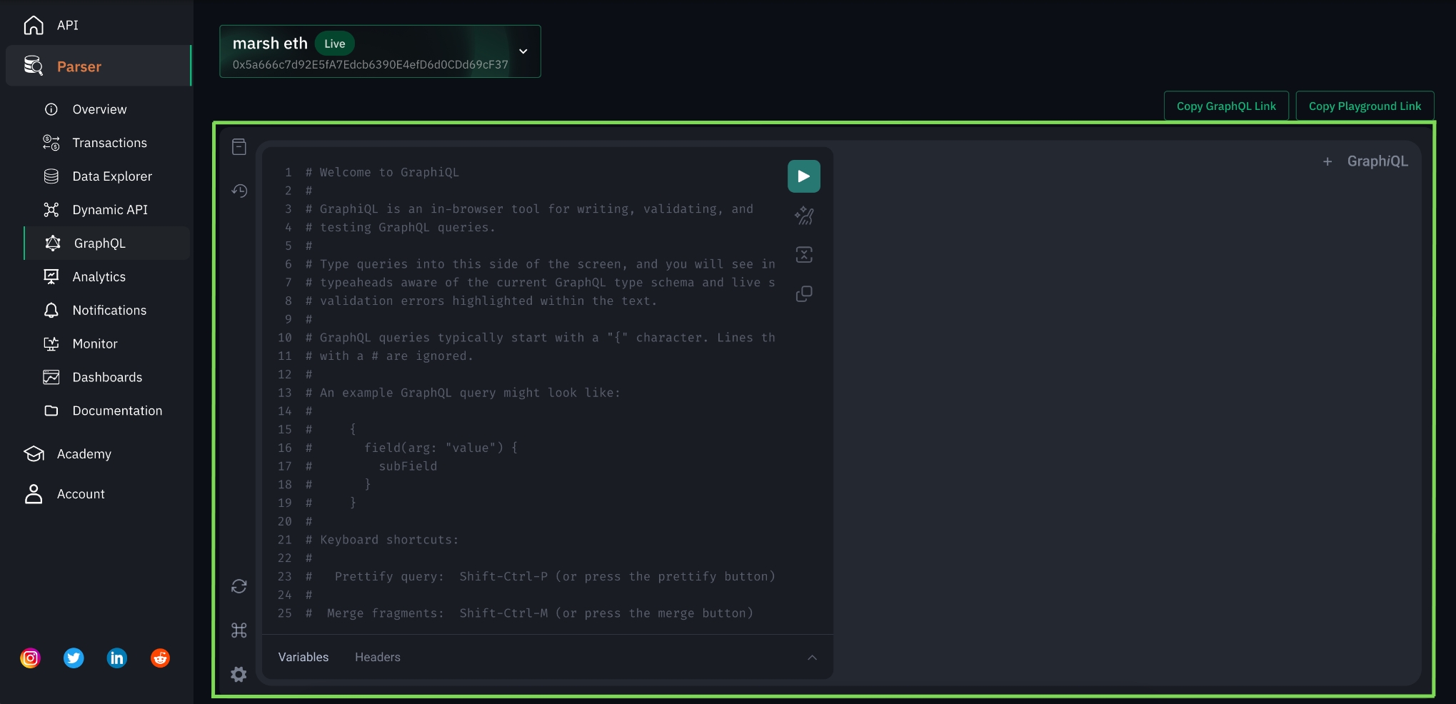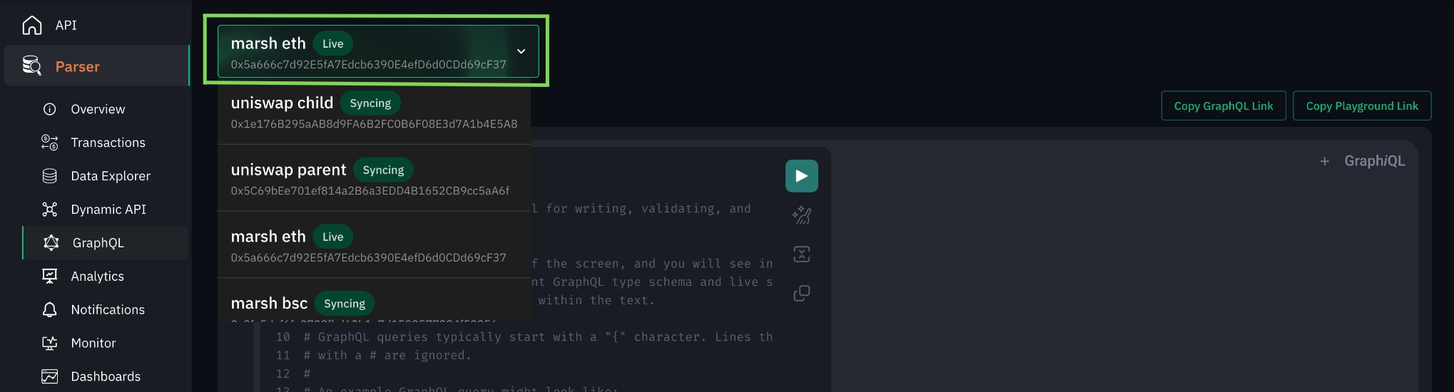 Select the parser to get parser specific GraphQL API and playground links for the parser you want to access through GraphQL as shown in Fig 1.4